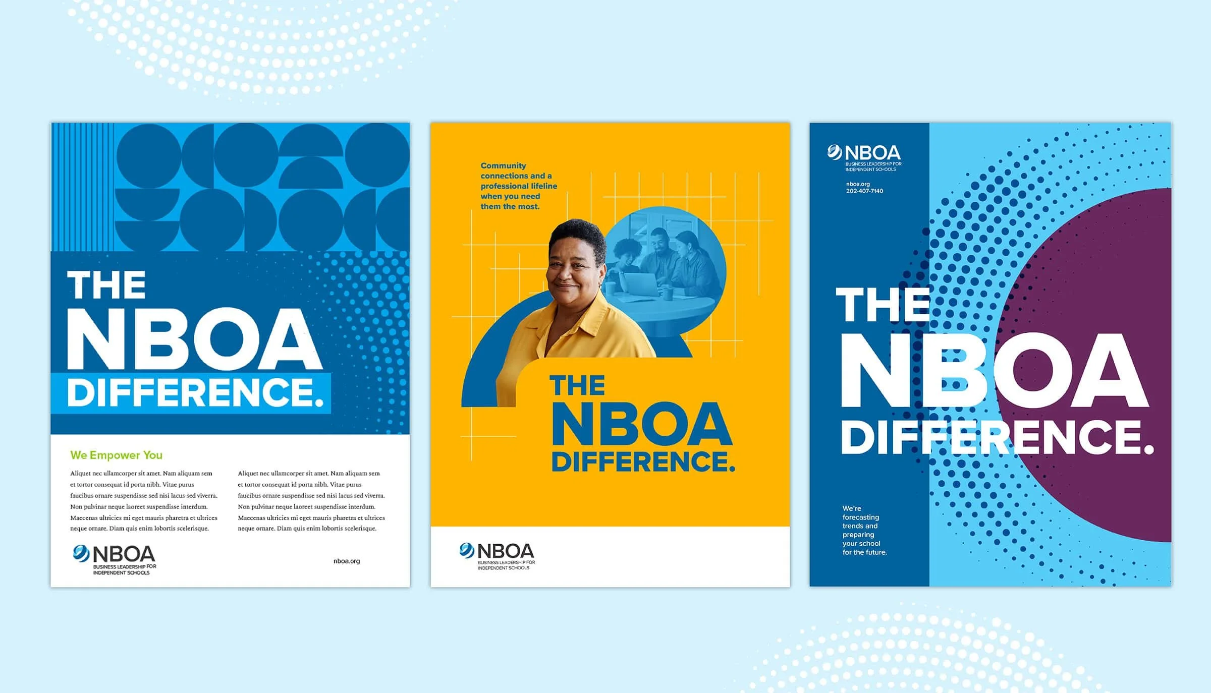 GRAPHEK partnered with NBOA to conduct a full-scale rebrand complete with extensive research and an inviting brand that would appeal to their multiple audience segments and drive membership engagement. The established brand uses custom patterns that were developed to echo aspects that business leaders in independent schools interact with daily and themes that represent membership benefits such as, growth, community, and resources. Motifs are used to help tie the brand together using distinctive design elements that pair well with a combination of patterns and images, and can be adapted across a span of collaterals.